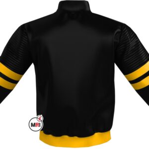 PM Jacket Made of PU Leather Polyester lining Two Front Pockets One Inside Pocket Front Zipper Front Both Side Embroidered Shoulder and Half Sleeve Beautiful Design Sleeve on center stripe Webbing on bottom cuff and collar S to 5XL USA True Sizes Best Quality Individual Packing