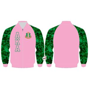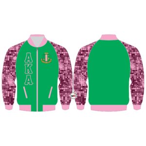 AKA Sequin Satin Jacket Made of Sequin Material/satin inside Polyester soft lining Front Zipper Style Front two pockets Inside One Pocket Front on both side Machine Embroidery Rib Band on bottom cuff and collar S to 5XL USA True Sizes Fully Customized Nice packing Best Quality